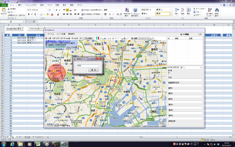 れます。それと同時にエクセルの領域列にサークル描画色と同じ色の○が付きます。