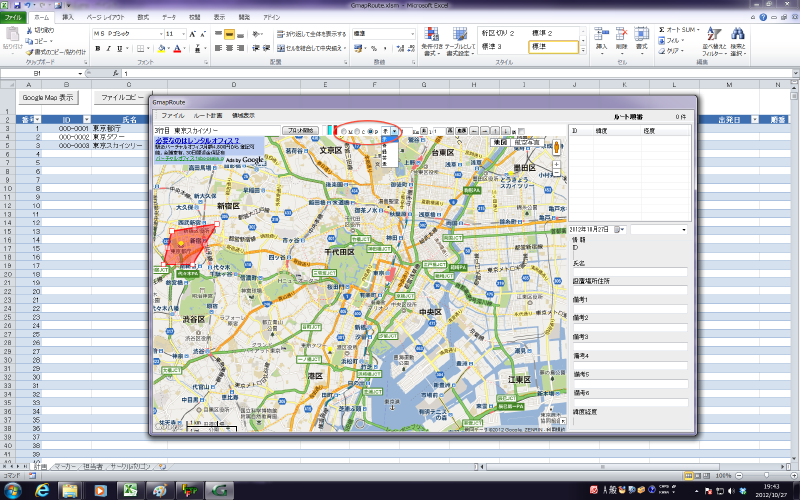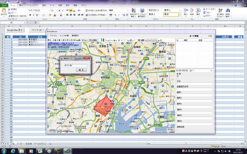 れます。それと同時にエクセルの領域列にポリゴン描画色と同じ色の○が付きます。